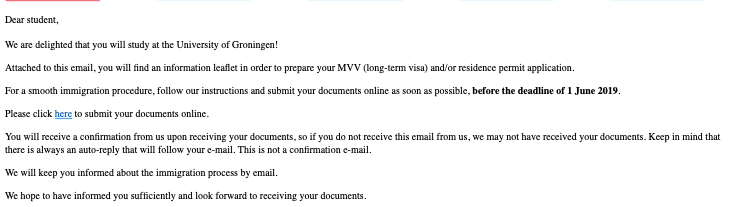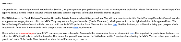 12 Juni 2019 saya mendapatkan notifikasi bahwa aplikasi MVV saya sudah diserahkan ke imigrasi dan akan memakan waktu selama 4 minggu. Dua minggu kemudian pada 25 Juni 2019 saya menerima notifikasi MVV saya sudah di-approve oleh Kantor Imigrasi Belanda dengan lampiran bukti approval dan formulir untuk dibawa ke Kedubes Belanda di Jakarta.